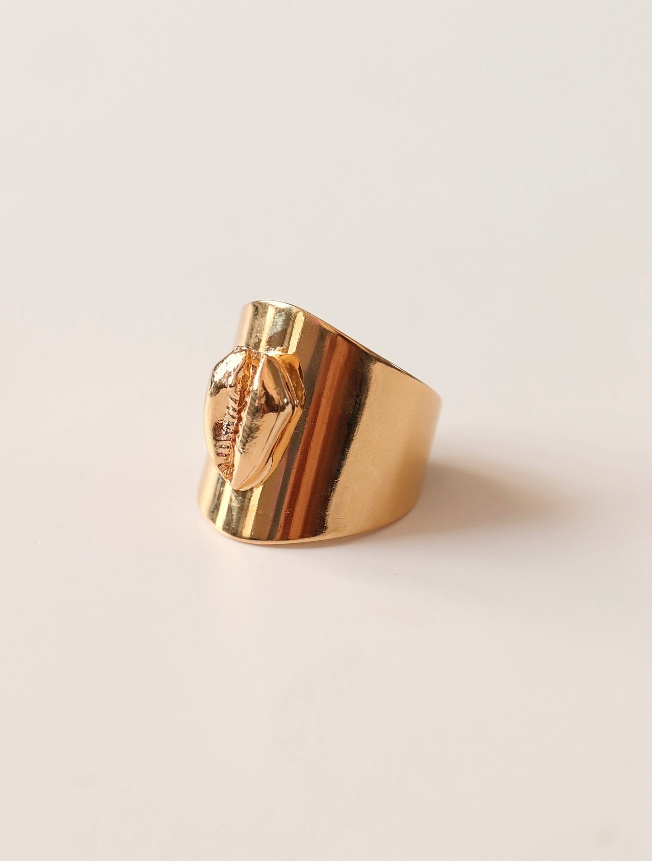 Bague Nérina, Inspiré des Néréides, les nymphes marines de la mythologie grecque. Sur sa base lisse et dorée repose un coquillage caurie, symbole de l'été. Ajustable, elle s’adapte à toutes les tailles de doigts.