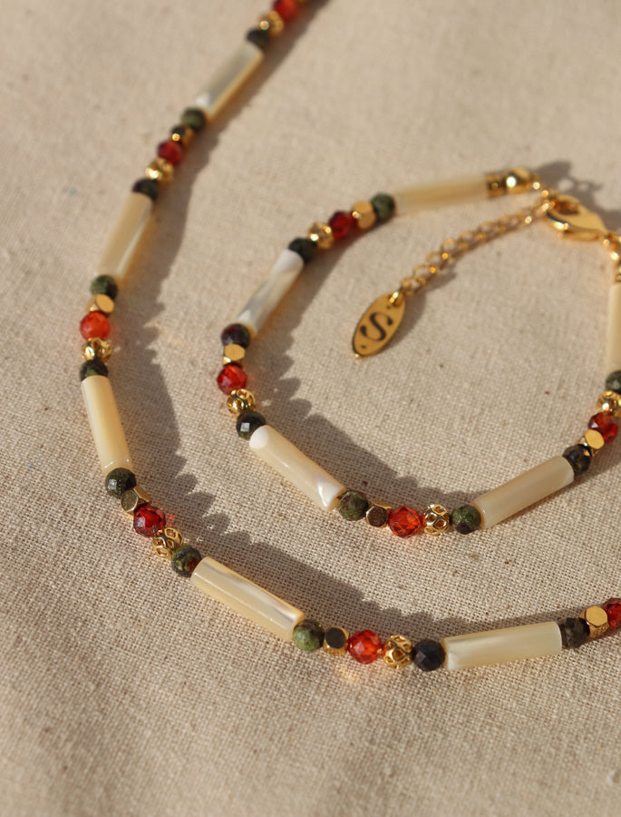 - Matériaux utilisés : Nacre Paloma, jaspe dragon d'Afrique et zirconiums de cornaline orangés