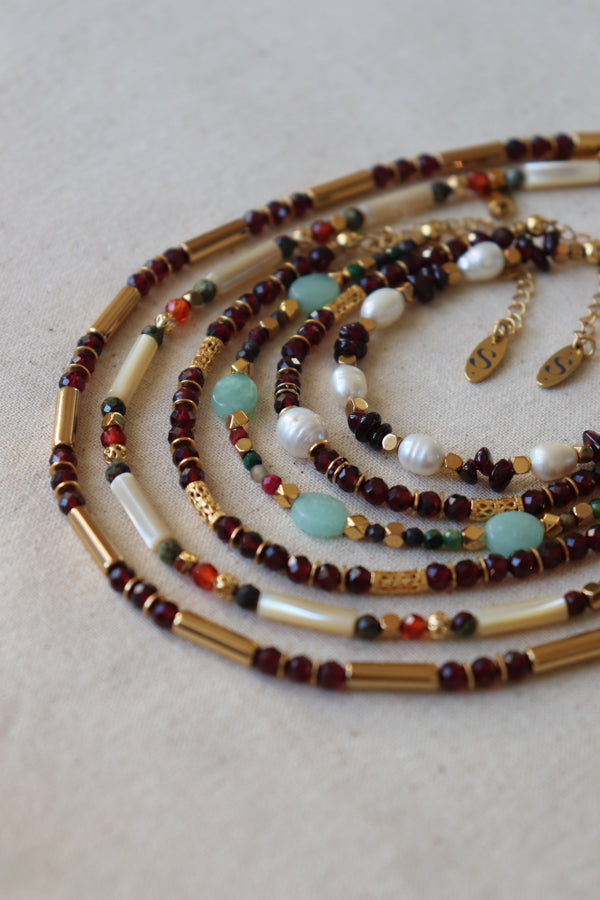 Les pierres et les perles utilisées sont naturelles ou semi-précieuses, offrant ainsi des variations subtiles de couleur qui rendent chaque bijou unique.